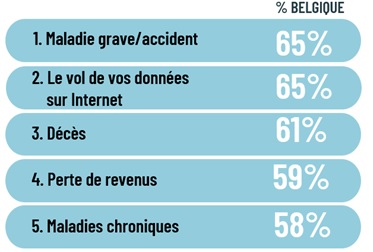 Des événements inattendus comme une maladie grave, un accident ou le décès de son partenaire peuvent avoir un impact financier et des conséquences sur des dépenses importantes telles qu’un prêt hypothécaire. Ainsi, 1 Belge sur 5 se dit même ‘très’ préoccupé. Pour 1 personne interrogée sur 3, le divorce - et ses conséquences financières - est également une source d’inquiétude.
