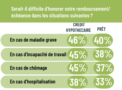 La volonté d’emprunter pour des projets modestes ou importants était faible au cours de la période de la Covid-19. C’est ce que montrait l’étude précédente réalisée en 2021. Aujourd’hui, nous sommes à nouveau légèrement au-dessus de ce niveau. Un constat valable pour les dépenses liées aux traitements médicaux, aux études, à l’équipement, aux vacances, etc., ainsi que pour l’achat d’un bien immobilier (67 %), les travaux de rénovation (51 %) et l’acquisition d’une voiture (47 %). Le crédit repart donc à la hausse, ce qui augmente le besoin de protection (voir tendances 2 et 3). Ceci est également lié à l’angoisse de ne pas pouvoir rembourser un crédit. Un quart des Belges a déjà été confronté à des problèmes de remboursement. Un groupe important pense également que le remboursement d’un prêt ou d’un crédit pourrait entraîner des problèmes financiers significatifs dans certaines circonstances. C’est ce que montrent les chiffres ci-dessous.